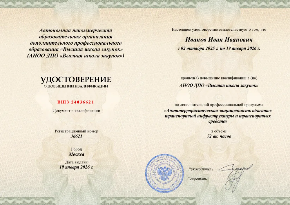 Повышение квалификации, 72 академических часов, 7 модулей: нормативно-правовые основы противодействия терроризму, анализ угроз и рисков, функциональные обязанности ответственных, инженерно-техническая укрепленность, документооборот и действия персонала при ЧС. Онлайн-обучение в в Липецке с итоговой аттестацией.