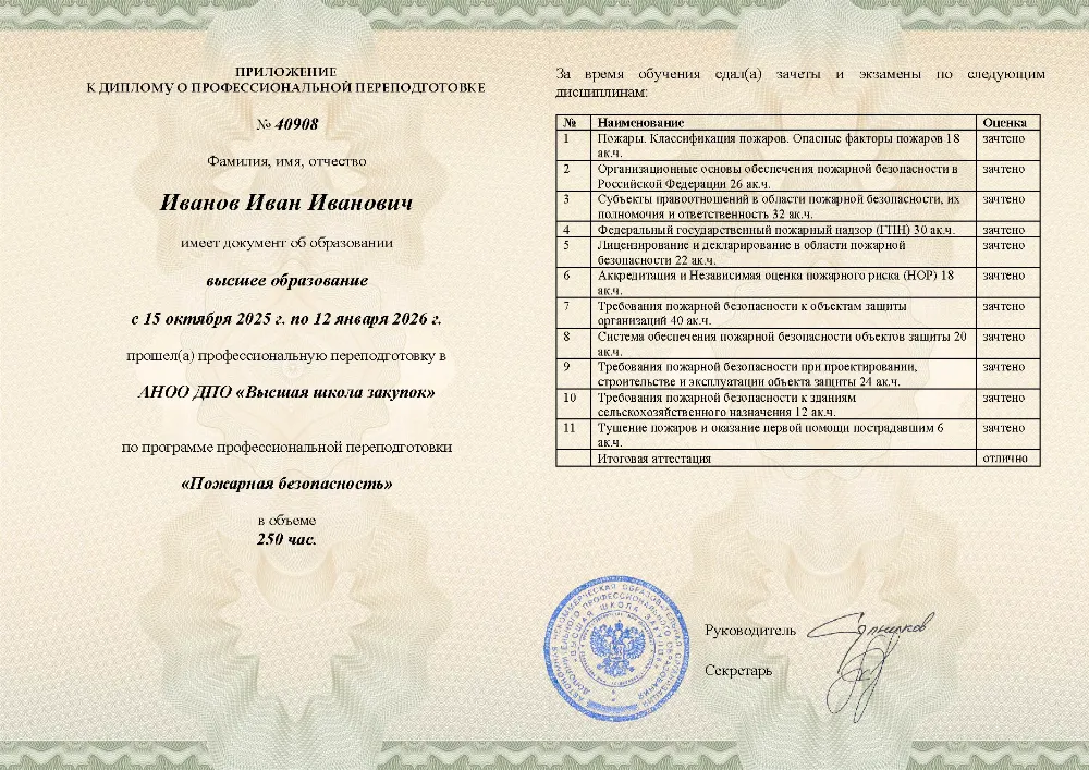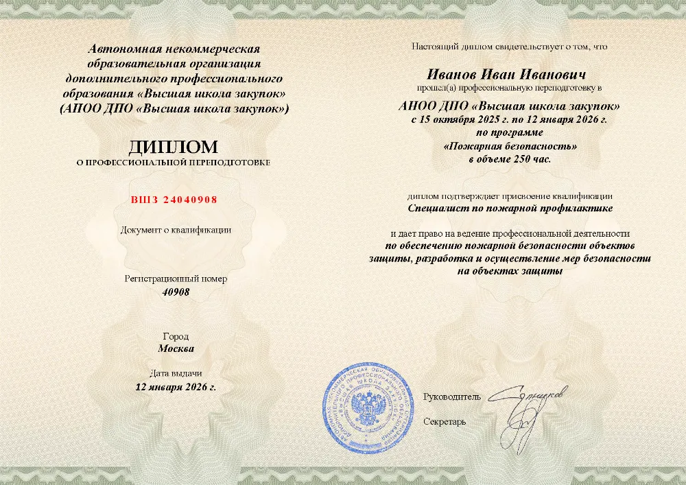 Профессиональная переподготовка, 250 академических часов, 11 модулей: организационные основы и законодательство в области пожарной безопасности, лицензирование и надзор, требования к объектам защиты, проектирование, тушение пожаров и оказание первой помощи пострадавшим. Онлайн-обучение в в Липецке с итоговой аттестацией.