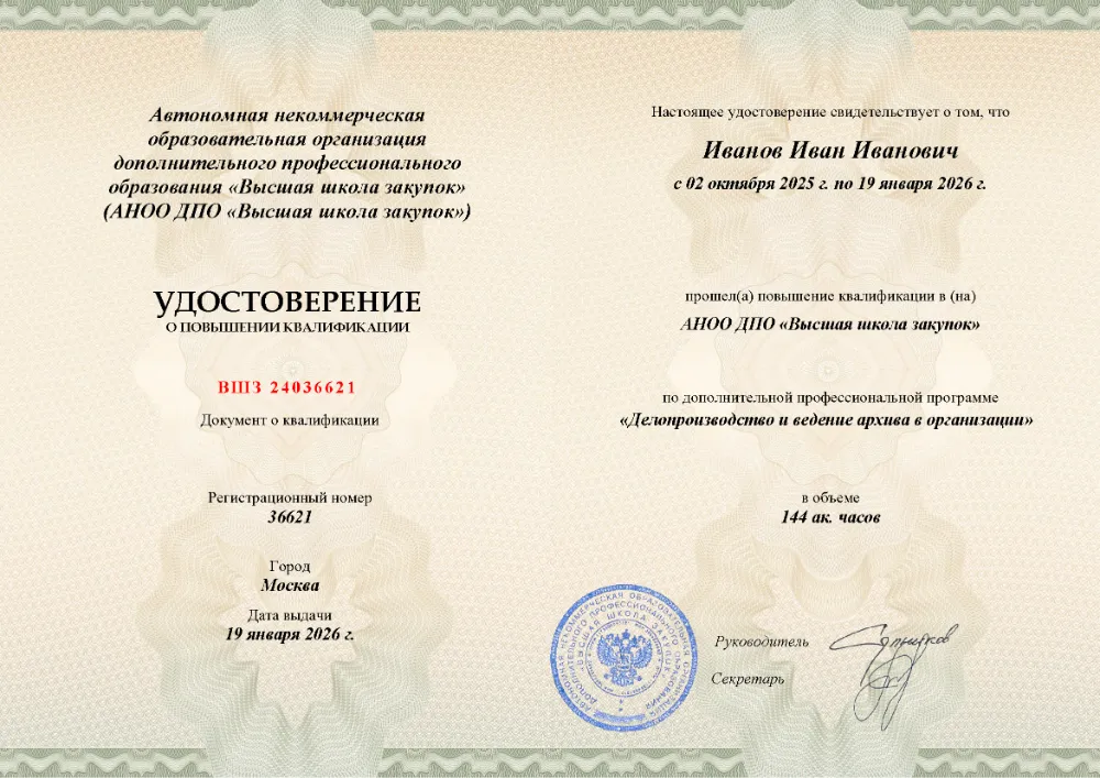 Программа повышения квалификации (144 часа) для специалистов по делопроизводству. Освойте ведение полного цикла документации и архива: от подготовки служебных и кадровых документов до работы с конфиденциальными материалами, международной перепиской и правилами хранения. Онлайн-обучение в в Липецке с итоговой аттестацией.